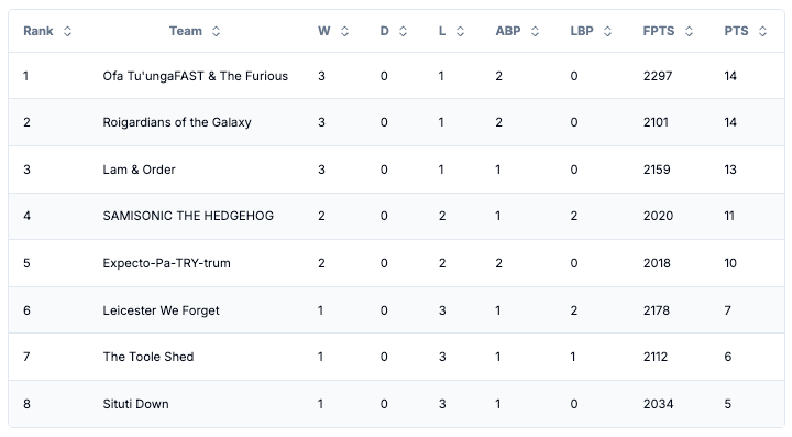 Blake’s Ofa Tu’ungaFAST & The Furious (696) put on a frankly unnecessary clinical display to dismantle Nabung’s absent Roigardians of the Galaxy (342). Much like in life, rather than deal with his problems, Nabung knew his roster was in trouble this round and decided to just take a snooze at the wheel. It’s cost him top place on the table and is replaced by his rival this week Blake.