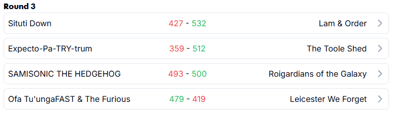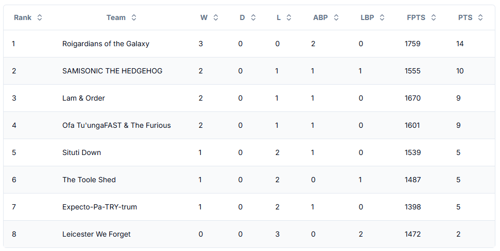 Nabung’s Roigardians of the Galaxy is now alone at the top of the table, but as we said last round now his roster is in for a challenging few weeks. Now also alone but at the bottom of the table Harry’s (Leicester We Forget) threw everything at round 3 to no avail, what can they do to bag themselves their first win of the season before this gets embarrassing.