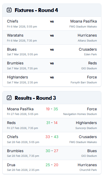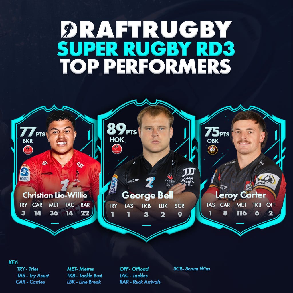 Super Rugby Pacific 2026 Round 3 is complete and again we were blessed with some great fixtures over the weekend. As a highly biased Australian it was lovely to see three Aussie sides get the W over our neighbours across the Tasman, the Force beating Moana Pasifika, the Reds showing some of that form we talked about in preseason toppling the dangerous looking Highlanders and the Brumbies leaving it till the final minutes to defeat the Blues in Canberra. The Chiefs & Crusaders was game of the round for mine with some tantalising footy on display and whilst the Drua overcame the Hurricanes in gritty conditions, but the weather really robbed us of the game we deserved to see!