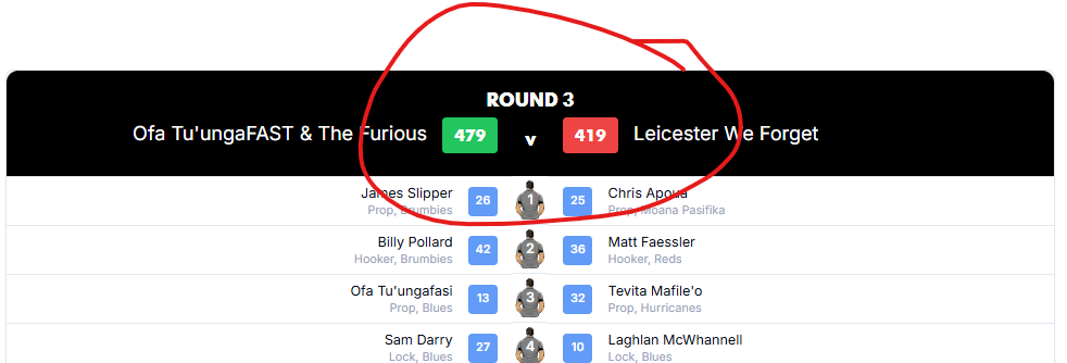 Wylie’s squad was powered by a hatrick and also round massive performance from Christian Lio-Willie (77) after a quiet opening first two rounds. Leroy Carter (75) scored perhaps the try of the season to date in a blockbuster Chiefs vs Crusaders fixture. Fraser McReight (72) & Josh Lord (52) continued their excellent form and kept the momentum going. How Wylie managed to score over 500 points whilst playing 2 men down without a starting lock or flyhalf and also forgetting to set his lineup again leaving a starting Finlay Christie (42) on the bench and playing a Folau Fakatava (3) off the bench instead… we’ll never know.
