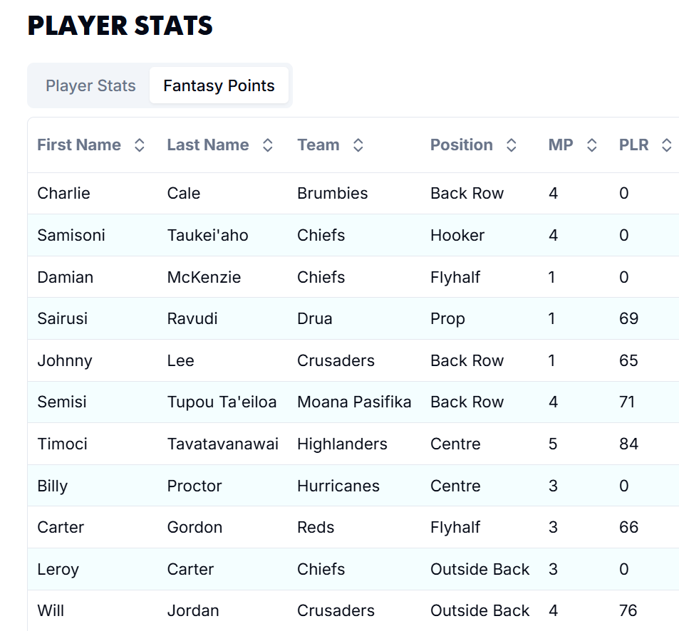Points Last Round (PLR): We have cleaned up the PLR function on our fantasy points table. It will now show the results from the last completed round of the competition, rather than the last completed round by that player. For example, Charlie Cale did not play in round 5, so his PLR is now 0. This means you’ve got an accurate way to quickly sort players by how they went in the last completed round of the competition