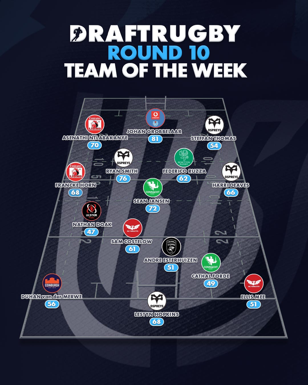 Jansen racked up points across a number of categories this round as Connacht gave Leinster a scare before the blue juggernaut pulled away. His 2 dominant tackles, 2 turnovers, and 2 offloads were all league highs for loose forwards. Additionally, he completed a heroic 18 tackles in an attempt to halt Leinster momentum – 72 points